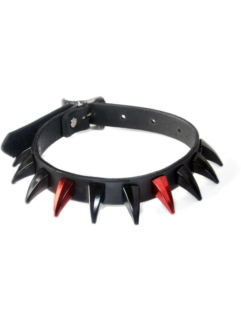 Made from real leather with finished edges, this leather choker sits smooth against the neck while the black claw spikes and two metallic red fangs steal the spotlight. Wear it as a gothic choker, punk collar, or dark streetwear accessory.