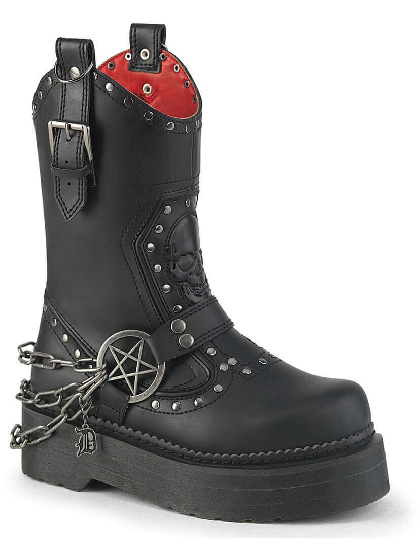 REBEL-56 brings together dark western styling and combat-inspired edge in a bold black calf boot. With its stacked 2 inch platform, embossed skull panel, silver-tone studs, chain detail, and pentagram harness, this pair makes a sharp statement from every angle.